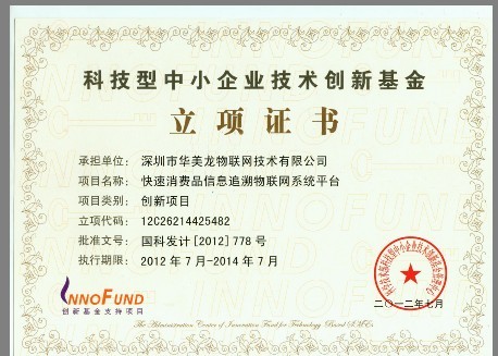 ??? ?科技型中小企業技術創新基金作為中央政府的專項基金,華美龍申報的快速消費品信息追溯物聯網系統平臺項目于2012年7月獲得了本年度的正式立項證書,項目基本信息如下: