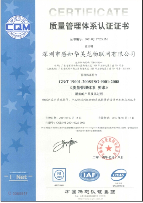 (本網訊 記者 張小燕)深(shen)圳市(shi)感知華美龍(long)物聯網有(you)(you)限公司(si)成立15年來始終嚴(yan)把質(zhi)量關(guan)和(he)安全關(guan),于近日第五次通過了(le)方圓標志認證集(ji)團有(you)(you)限公司(si)ISO9001-2008質(zhi)量體系(xi)認證,并根據“安全、創新、服務、合作(zuo)、發展”的(de)質(zhi)量方針,把貫徹標準作(zuo)為全面提升企業(ye)質(zhi)量治理水平的(de)最佳途徑,強化質(zhi)量意識(shi),建立了(le)有(you)(you)效的(de)質(zhi)量保(bao)證體系(xi),取得了(le)顯著(zhu)的(de)質(zhi)量成效。