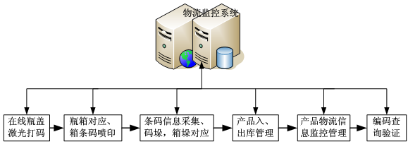 利 用整箱賦碼技術在每一瓶啤酒的瓶蓋上打印一組身份信息數碼、每個紙箱指定位置噴印相應的條形碼信息,實現單瓶與成品箱的對應賦碼。碼垛時,將箱和托盤組成 對應關聯。系統通過對生產、入庫、倉庫管理、出庫發貨、報損、盤點等環節的追溯管理,可對每一瓶酒的相關信息進行精確的信息追溯。